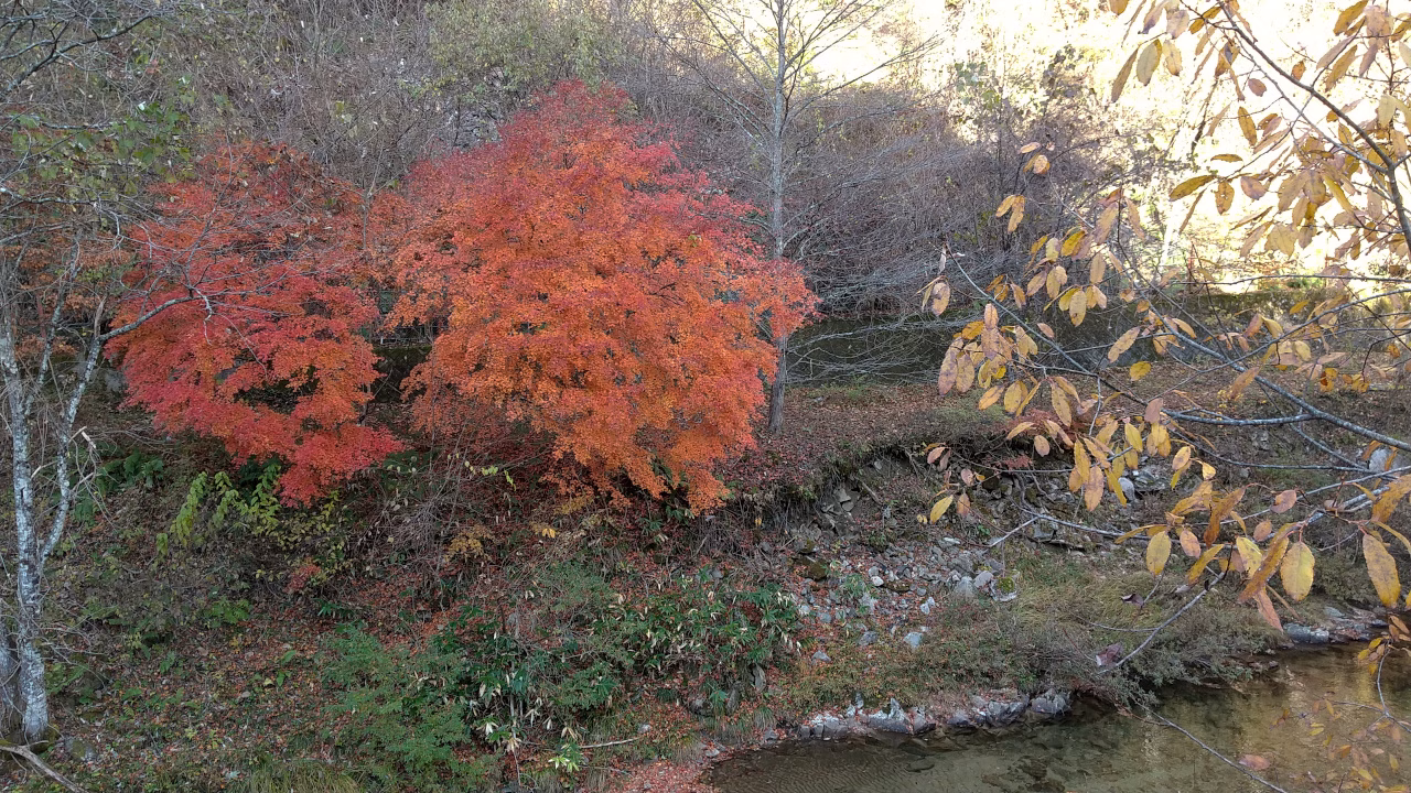 真っ赤に色づくカエデに囲まれた駐車場に着き、期待MAXで谷に下りていきました。